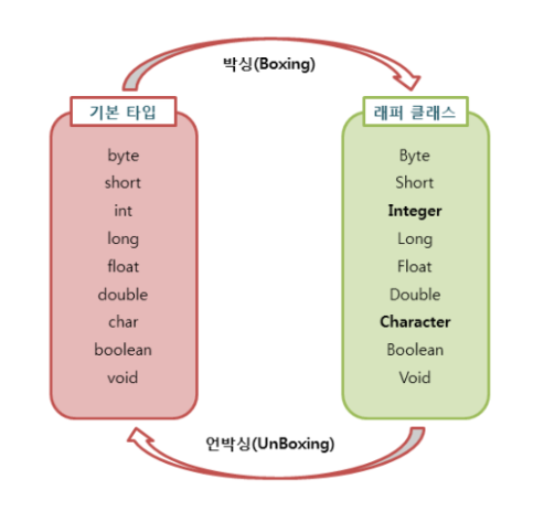프로그래밍을 하다 보면 기본 타입의 데이터를 객체로 표현해야 하는 경우가 종종 있습니다. 이럴 때에 기본 자료타입(primitive type)을 객체로 다루기 위해서 사용하는 클래스들을 래퍼 클래스(wrapper class)라고 합니다.