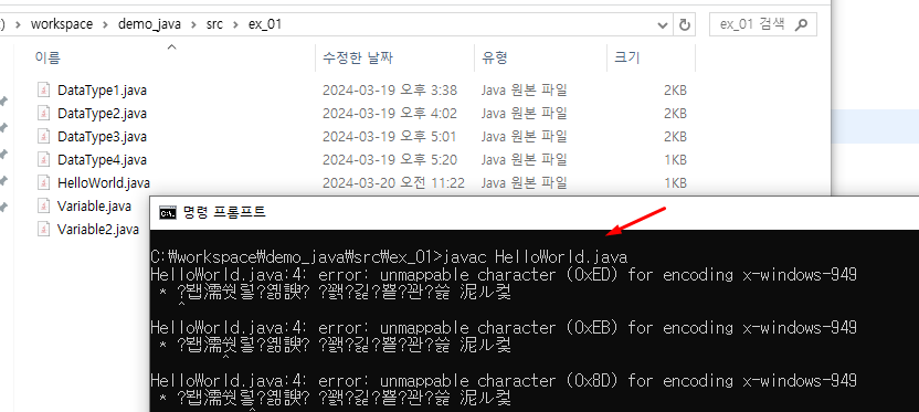 명령어를 사용하여 컴파일 및 실행 해보기. (소스 코드에 한글이 포함되어 있다면 오류가 발생한다.)