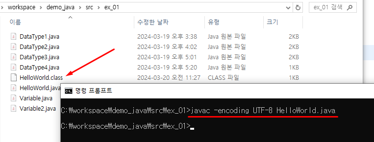 1. HelloWorld.java 파일을 명령프롬프트에서 컴파일 해보자.