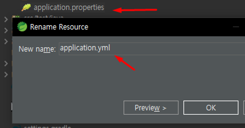 spring boot 프로젝트 설정을 yml 형식에 문법을 사용할 예정 입니다. 설정파일 기본 확장자 properties 에서 yml 형식에 파일로 변경할 예정입니다. 보다 보일러플레이트 코드를 줄이기 위함과 좀 더 간편한 진행을 위해 수정 아래 처럼 수정해주세요