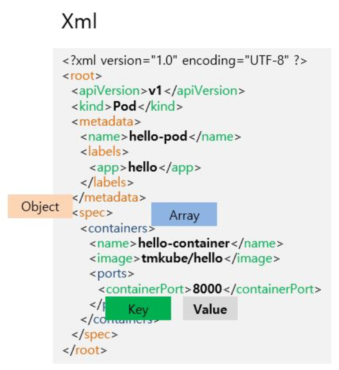 태그형식을 통해서 Key와 Value를 구분하고, 태그안에 태그를 넣어서 부모와 자식관계의 구조를 나타냅니다. 근데 위에 Object와 Array 부분은 표시를 해놨지만 Xml포맷상으로는 구분이 안되는 부분도 있습니다.
