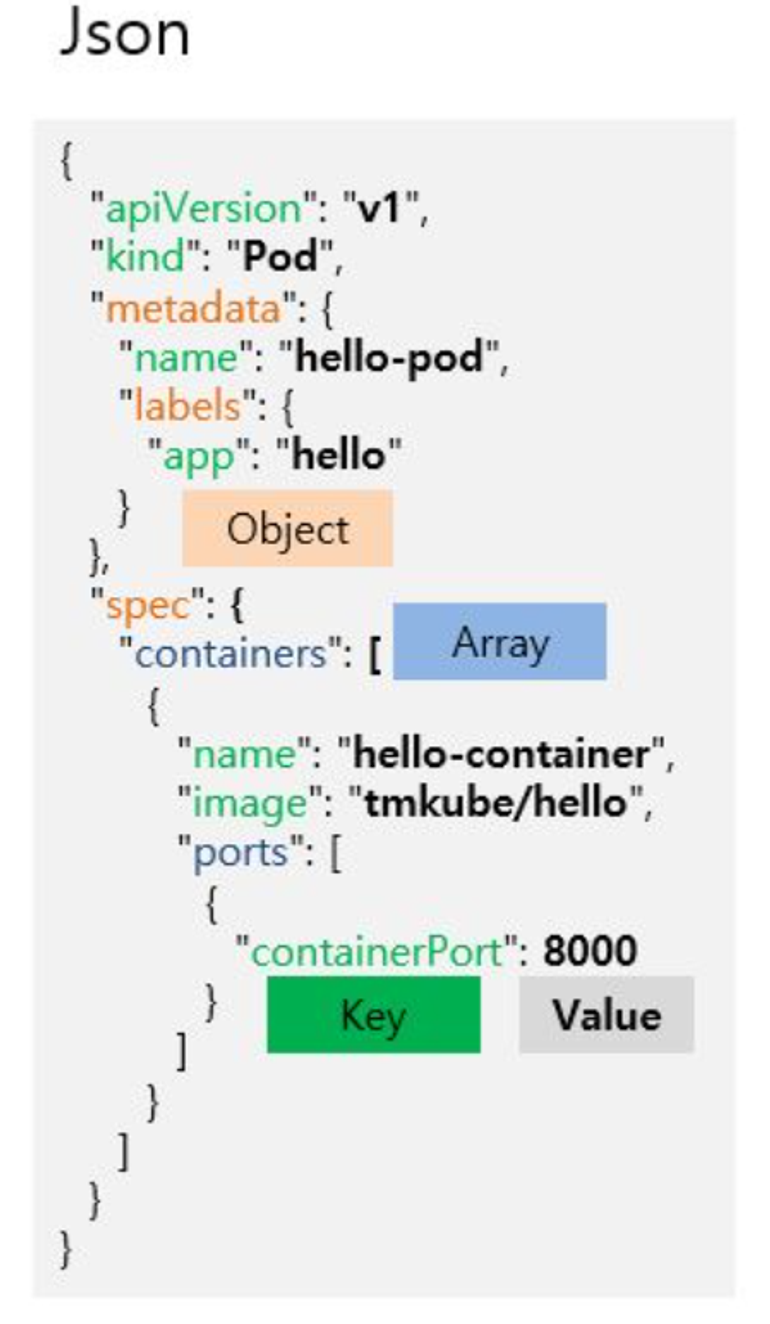 이름/값 쌍의 집합: 여기서 이름(키)은 항상 문자열이며, 값은 문자열, 숫자, 배열, 불리언(true/false), null 또는 다른 객체가 될 수 있습니다. 이 구조는 다양한 언어에서 객체(object)로 실현됩니다.