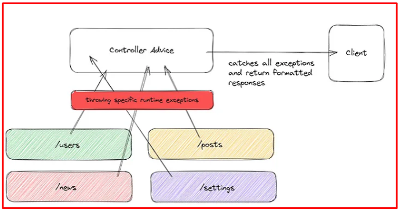 - @RestControllerAdvice: **@ControllerAdvice**와 유사한 기능을 제공하지만, **@RestController**에서 발생하는 예외를 처리하는 데 특화되어 있습니다. 즉, RESTful 웹 서비스에서 JSON이나 XML 같은 응답을 반환할 때 사용됩니다. 사실상, **@RestControllerAdvice**는 **@ControllerAdvice**에 **@ResponseBody**를 추가한 것과 동일한 효과를 제공하여, 응답 본문에 직접 데이터를 매핑할 수 있습니다.