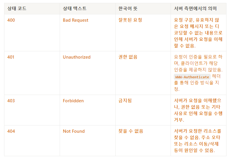 - 없는 페이지를 요청하는 등 클라이언트의 요청 메시지 내용이 잘못된 경우를 의미합니다.