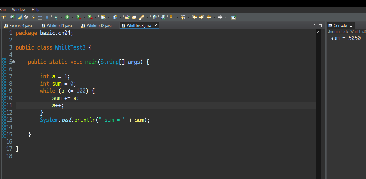 ● 주어진 조건에 맞는 동안(true) 지정된 수행문을 반복적으로 수행하는 제어문