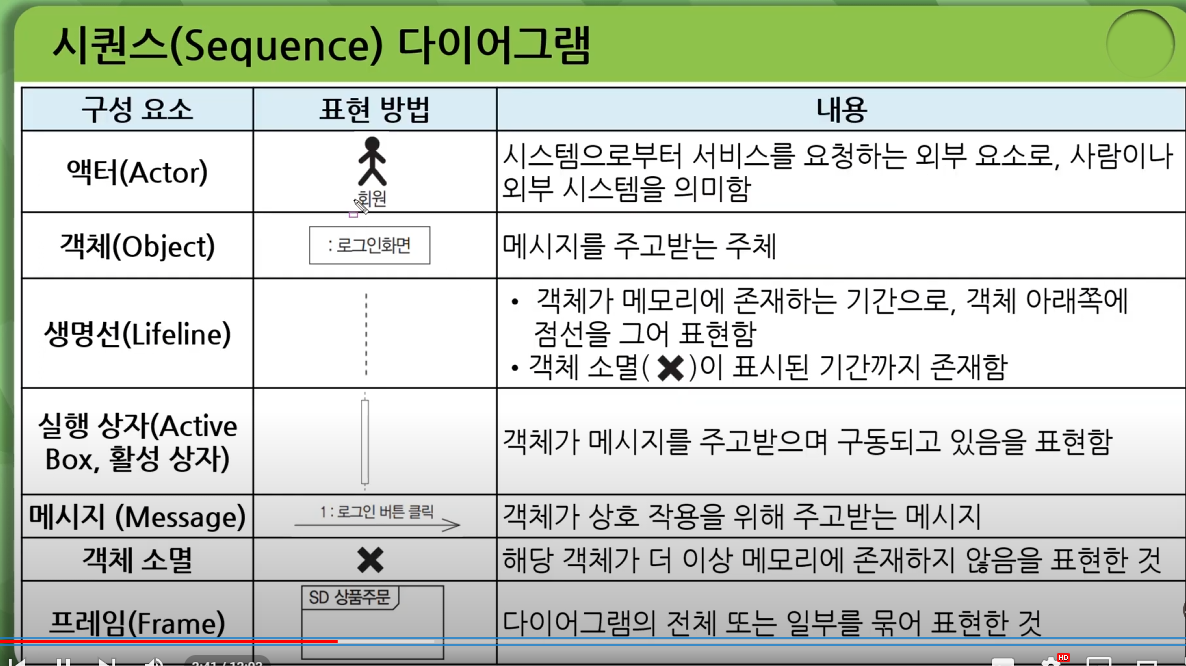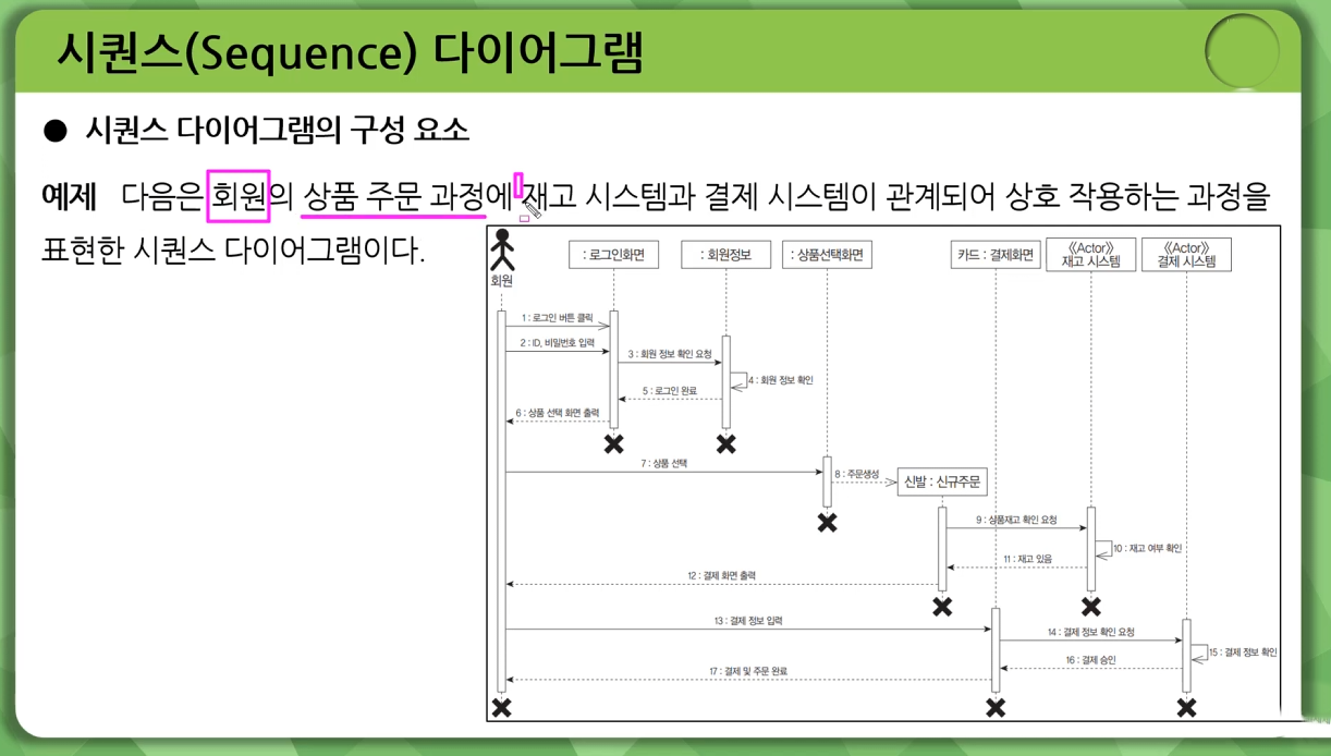 시스템이나 객체들이 상호 작용 과정에서 주고받는 메세지를 표현함