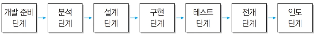 요구 분석 단계 --> 설계 단계 --> 구현 단계 --> 테스트 및 검증 단계 --> 인도 단계
