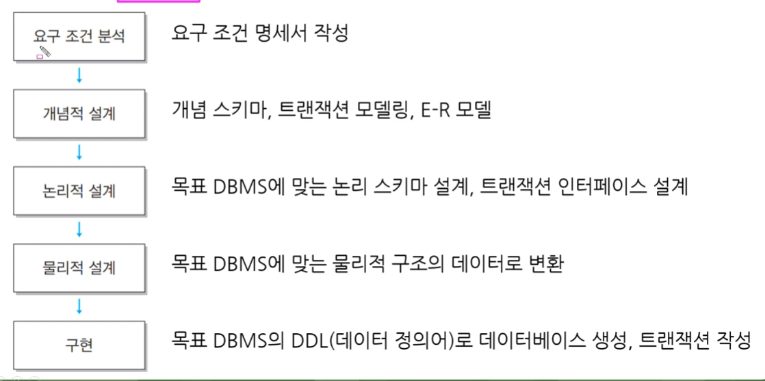 데이터베이스 설계는 사용자의 요구를 분석하여 그것들을 컴퓨터에 저장할 수 있는 데이터베이스의 구조에 맞게 변형한 후 DBMS로 데이터베이스를 구현하여 일반 사용자들이 사용하게 하는 것