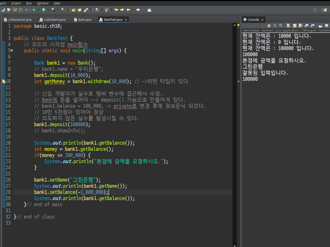 객체의 각각의 상태값은 직접 변수를 통해서 변경하는 것이 아닌 기능(행위, 메서드)을 통해서 변경하게 설계 해야 한다.