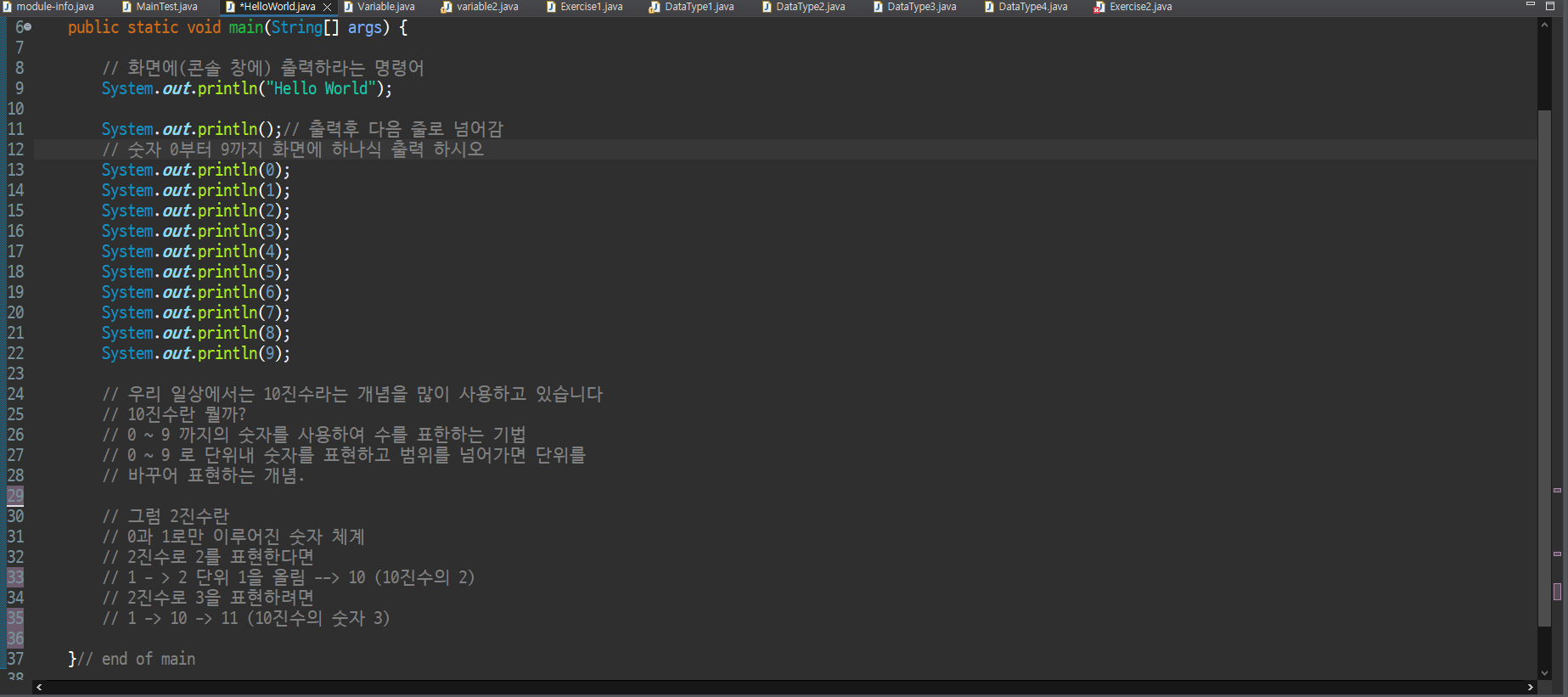 첫 프로젝트 생성, 주석, 화면에 데이터 출력하기, 10진수라는 개념