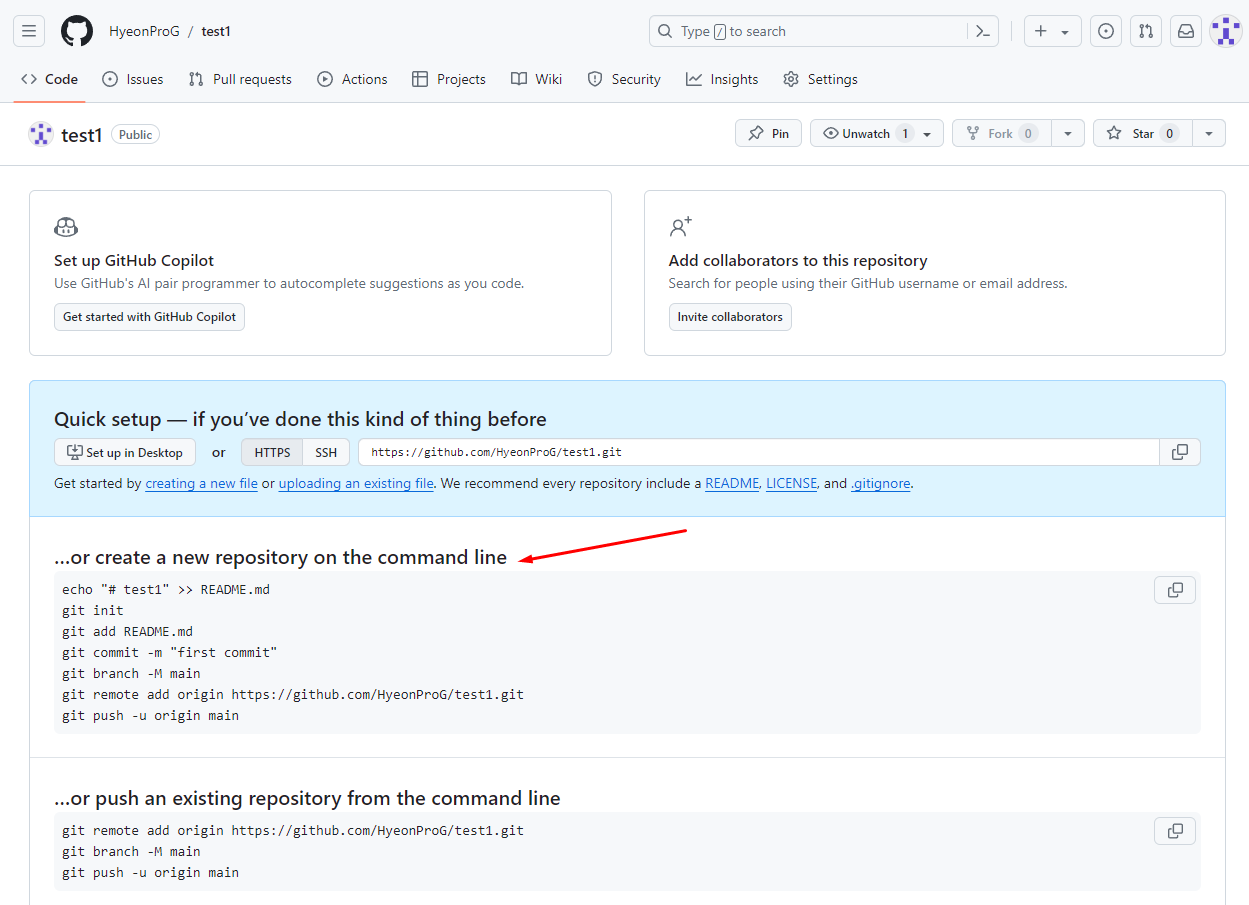 화살표가 가리킨 명령어를 Git bash를 통해 수행합니다.