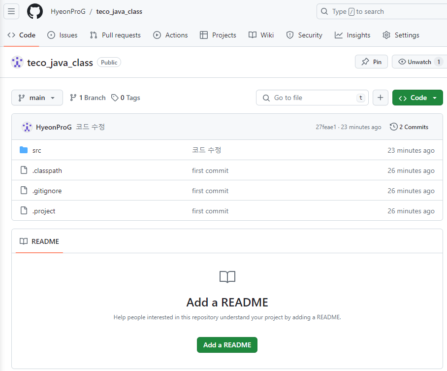 완료가 되고 깃허브 사이트를 새로고침 해주면 완료