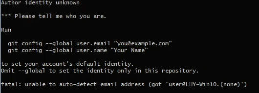 이러한 화면이 출력이 되면 git에서 이메일, 이름을 지정하지 않은 것이므로