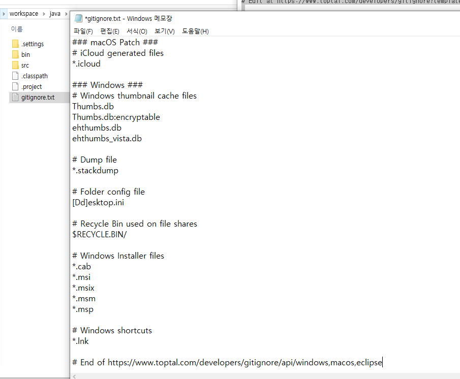 메모장에 gitignore.txt 파일 생성 후 gitignore.io 사이트에 나온 텍스트를 전체 복사, 붙여 넣기