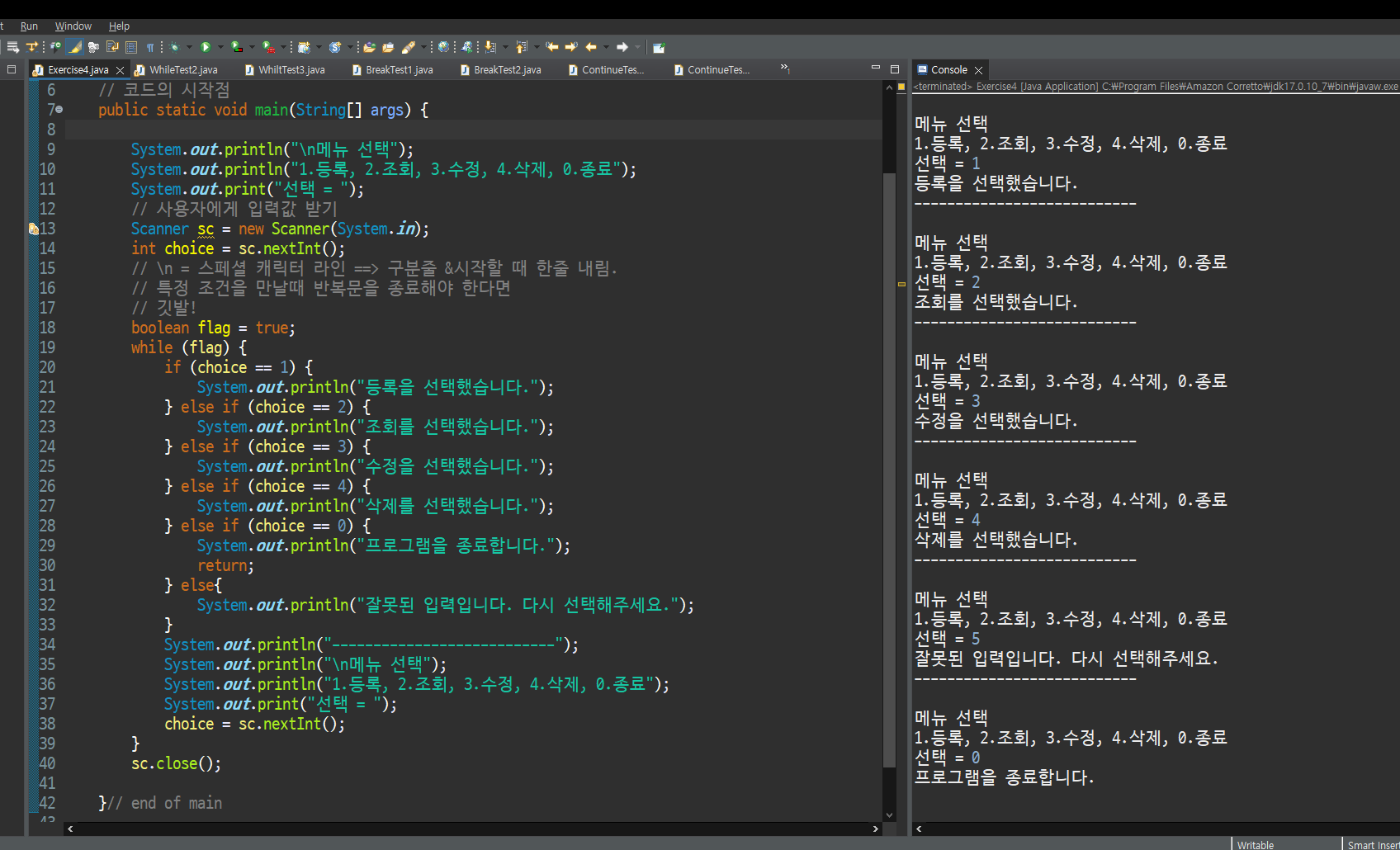 Java Class - 22 반복문과 조건문 {연습문제} Exercise4 자바 파일을 만들어 주세요 당신은 자바를 사용하여 간단한 메뉴 선택 시스템을 개발하는 작업을 맡았습니다. 이 시스템은 사용자에게 여러 옵션 중 하나를 선택하도록 요청하고, 사용자의 선택에 따라 적절한 메시지를 출력해야 합니다. 프로그램은 사용자가 '종료' 옵션을 선택할 때까지 반복해서 실행되어야 합니다. 요구 조건 사용자에게 다음 옵션을 보여주고 선택하도록 요청합니다 “1.등록 2.조회 3.수정 4.삭제 0.종료” 사용자가 옵션 번호를 입력하면, 해당 옵션에 대한 메시지를 출력합니다. 예를 들어, 사용자가 '1'을 선택하면 "등록을 선택했습니다."라고 출력합니다. 사용자가 '0'을 선택하면 "프로그램을 종료합니다."라는 메시지를 출력하고 프로그램을 종료합니다. 사용자가 유효하지 않은 번.. Java/Java 기초 문법 2024.04.12