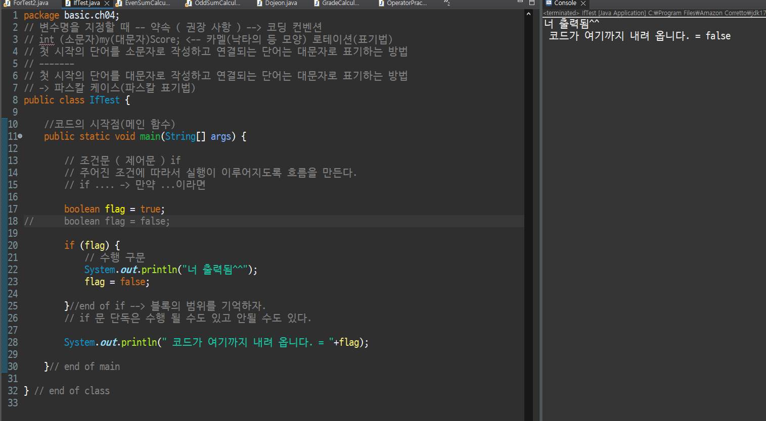 Java Class - 18 # 조건문 if(만약 … 이라면) 1. 조건문이란? 조건문은 프로그래밍에서 특정 조건을 평가하고, 그 결과에 따라 다른 실행 흐름을 따르도록 하는 구문입니다. 즉, 조건문을 사용하면 주어진 조건이 참(true)일 때와 거짓(false)일 때 수행할 작업을 다르게 지정할 수 있습니다. 조건문은 3가지 형태를 가지는데 if 문 , if / else 문 if / else if / else 문의 형태를 가진다. 실습 Java/Java 기초 문법 2024.04.11