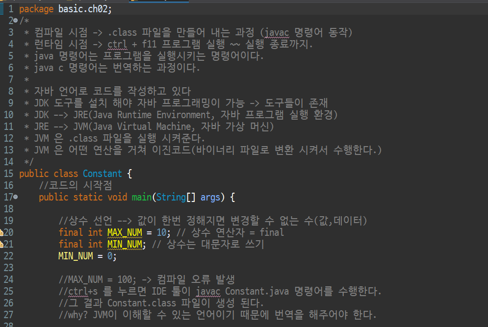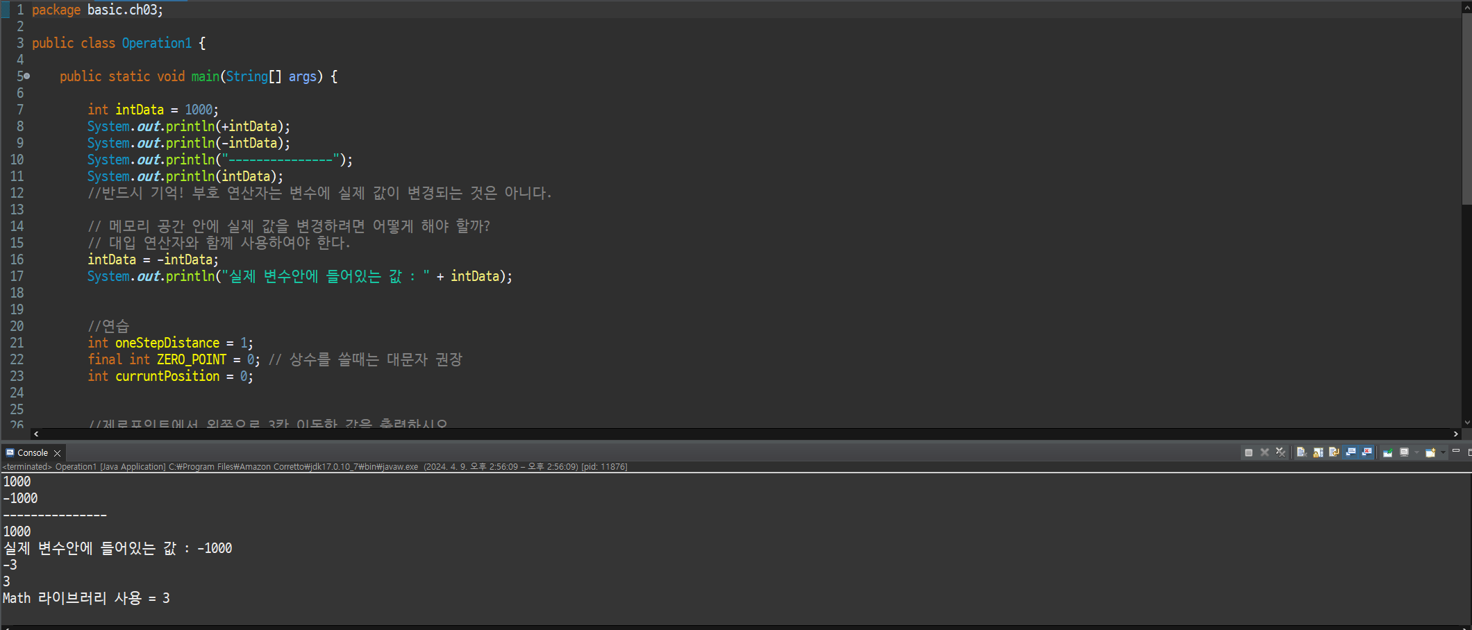 항(Operands)과 연산자(Operators) 연산 과정에서 사용되는 데이터나 값을 항(Operands)이라고 합니다. 하나 이상의 항을 사용하여 특정 연산을 수행하는 기호를 연산자(Operators) 라고 합니다. 대입 연산자 (Assignment Operator) : ‘ = ‘ 대입 연산자는 특정 값이나 다른 변수의 결과를 변수에 할당(대입)하는 데 사용됩니다. 대부분의 이항 연산자 중에서 실행 우선순위가 가장 낮아서, 대부분의 연산이 이루어진 후에 마지막으로 값이 할당됩니다. (연산에 순서는 오른쪽에서 왼쪽으로) 기본 형태는 왼쪽 변수 = 오른쪽 표현식(값, 변수, 또는 계산식)입니다. 부호 연산자 : ‘ +, - ‘ 부호 연산자는 변수의 부호를 변경하거나 유지하는 단항 연산자입니다. 연산자는 ..