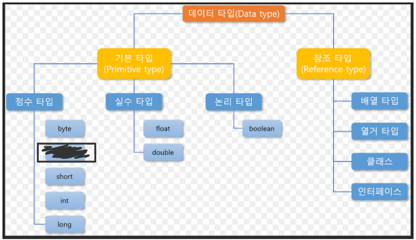 Java Class - 3 : 데이터 타입(정수형) 1. 데이터 타입이란 뭘까? 자바에서 데이터 타입(자료형, Data type)은 어떤 값의 유형을 뜻한다. 데이터 타입에 따라 값이 차지하는 메모리 공간의 크기와, 값이 저장되는 방식이 결정된다. 데이터 타입은 자료형이라고도 한다. Java/Java 기초 문법 2024.04.08