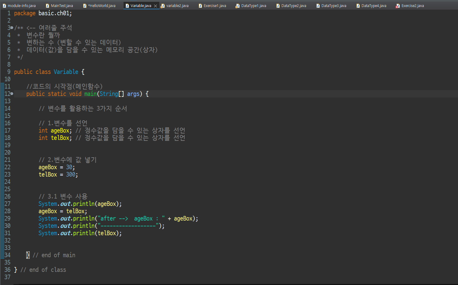 Java Class- 2 : 변수(Variable) 변수란? 변할수 있는 수 데이터(값)를 담을 수 있는 상자(메모리 공간) 변수란 데이터를 담을 수 있는 메모리 공간이며 같은 종류에 데이터 타입(?)의 값을 넣을 수 있다. 변수의 규칙 정리 자바언어에서 미리 선점한 키워드 (변수 이름으로 사용할 수 없음) 연습 예제. Java/Java 기초 문법 2024.04.08